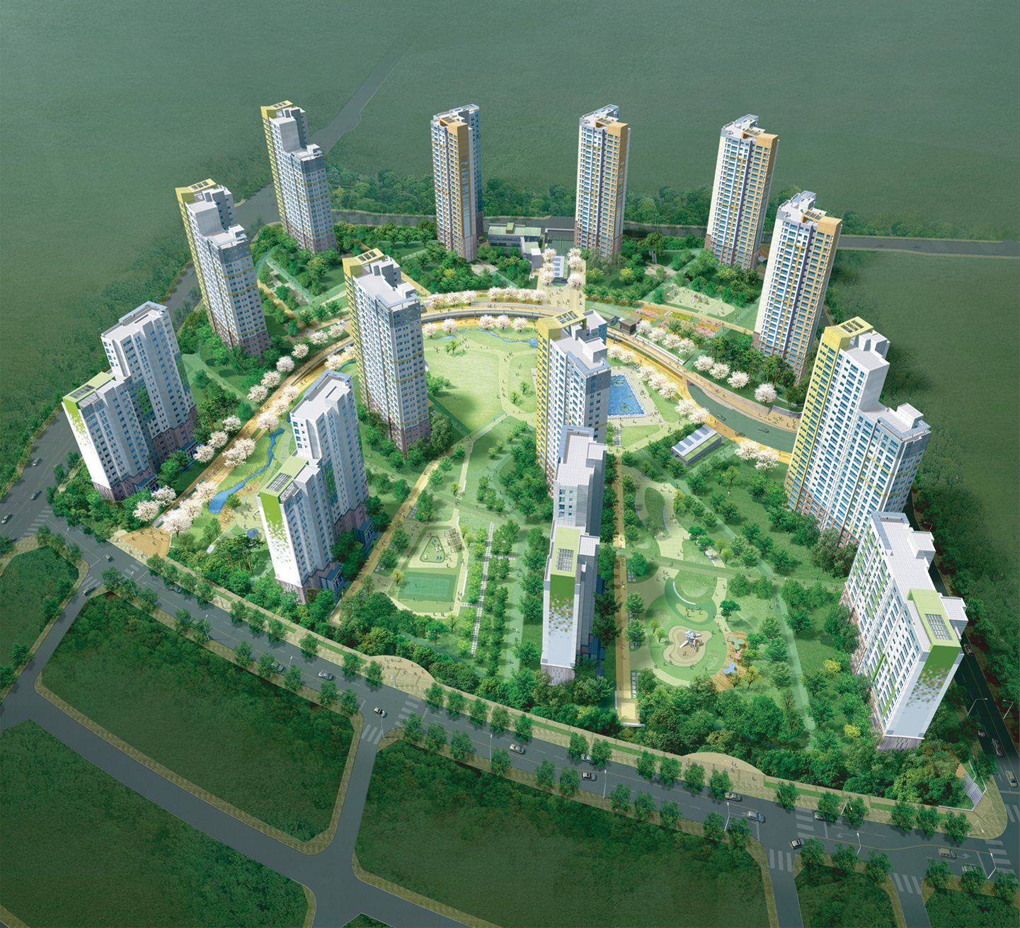 또한, 단지중앙으로 흐르는 유기적인 시설물 네트워크를 구축하여 사람과 공기가 건강하게 융합되는